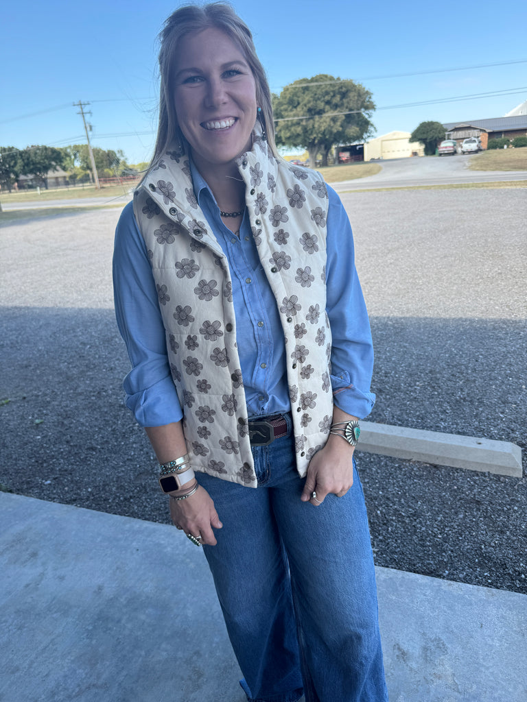 Soft cream vest adorned with sweet brown floral accents, it’s the perfect blend of softness and style.Button up front, runs true to size